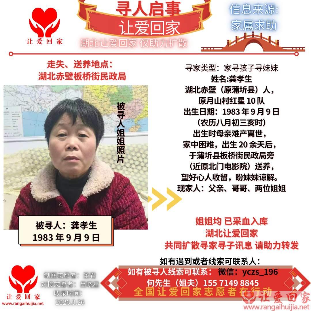 发生经过 :我们全家急寻失散多年的妹妹——龚孝生,妹妹籍贯为湖北省赤壁市(原蒲圻县),原户籍所在地为原蒲圻县月山村红星10队。 妹妹出生于1983年9月9日(农历八月初三亥时),出生时母亲因难产不幸离世,当时家中条件十分困难,无力抚养,无奈之下,在妹妹出生20余天后,于原蒲圻县板桥街民政局旁(临近原北门电影院)将其送养,盼有好心人家能收留善待她。 如今,父亲、哥哥和两位姐姐一直牵挂着妹妹,多年来从未停止寻找,心中满是愧疚与思念,也盼妹妹能够谅解当年的无奈之举。 如有知晓妹妹龚孝生相关线索,或妹妹本人看到此帖,恳请及时与我们联系,盼早日重逢,阖家团圆!