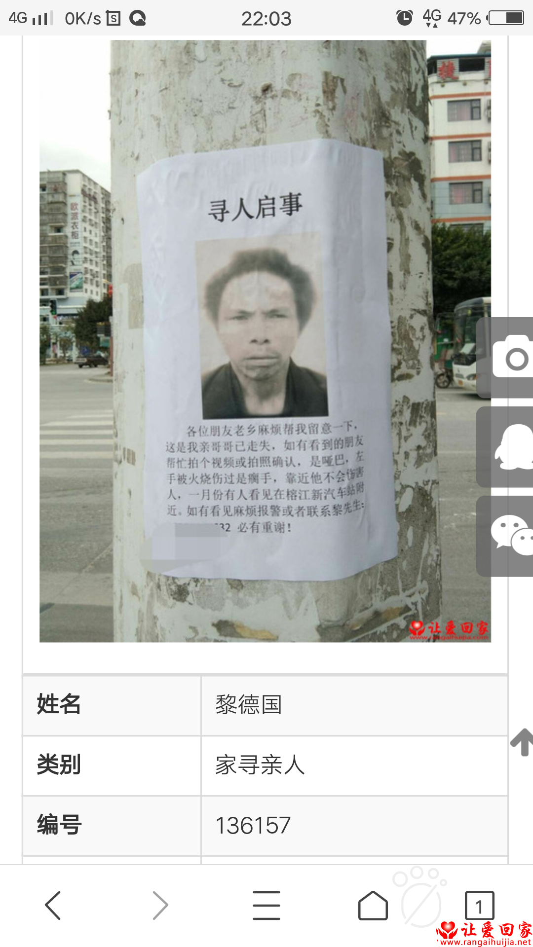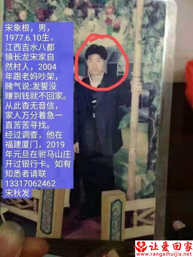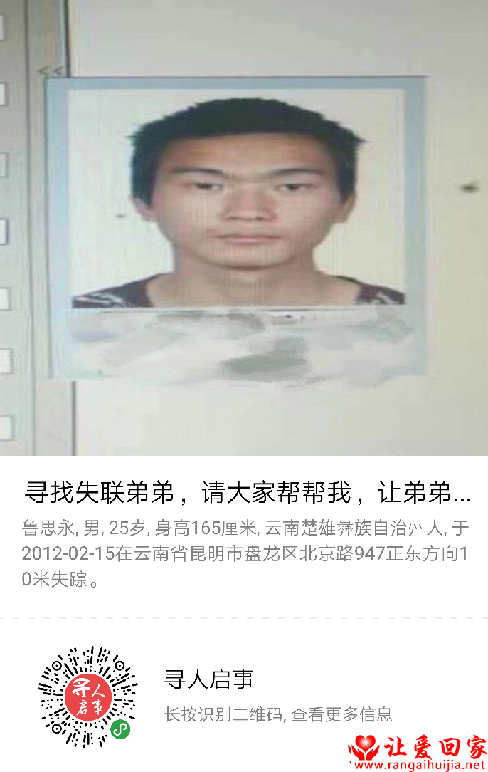 注意: 让爱回家为纯公益网站,所有寻亲帮助均为免费,不收取任何费用,请勿上当受骗。