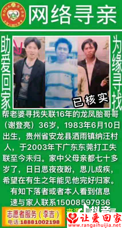 注意: 让爱回家为纯公益网站,所有寻亲帮助均为免费,不收取任何费用,请勿上当受骗。