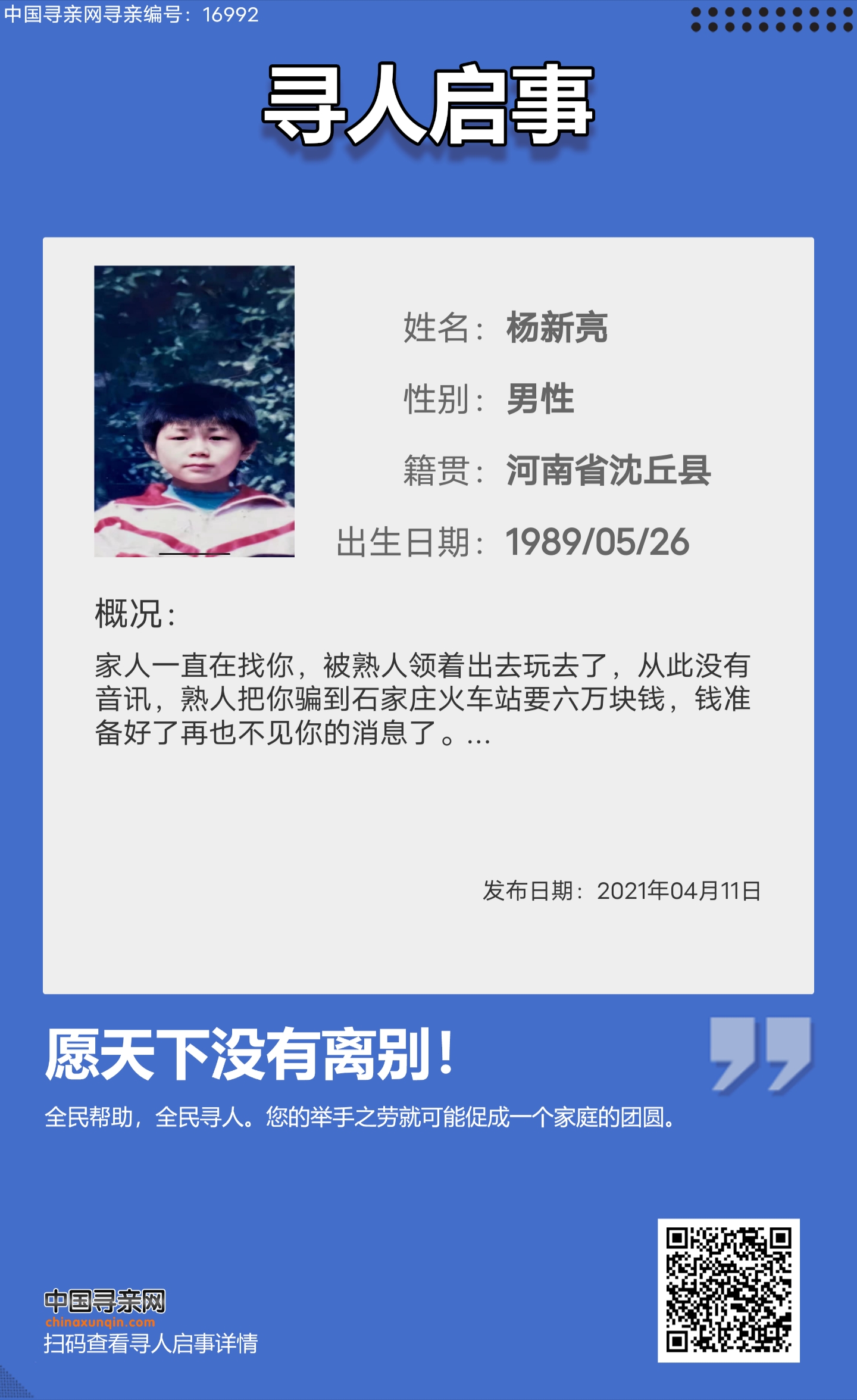 注意: 让爱回家为纯公益网站,所有寻亲帮助均为免费,不收取任何费用,请勿上当受骗。