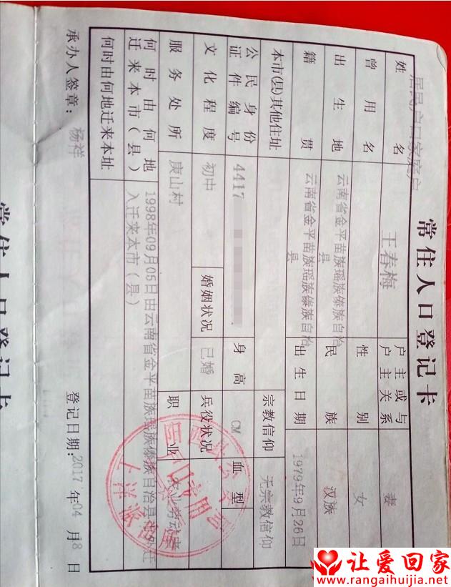 注意: 让爱回家为纯公益网站,所有寻亲帮助均为免费,不收取任何费用,请勿上当受骗。