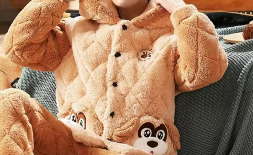 特征描述 :形象:上身胖胖的 身穿卡其色冬装睡衣 头戴浅紫色毛线帽 下身穿黑裤子、黑皮鞋 眼睛大大的 双眼皮